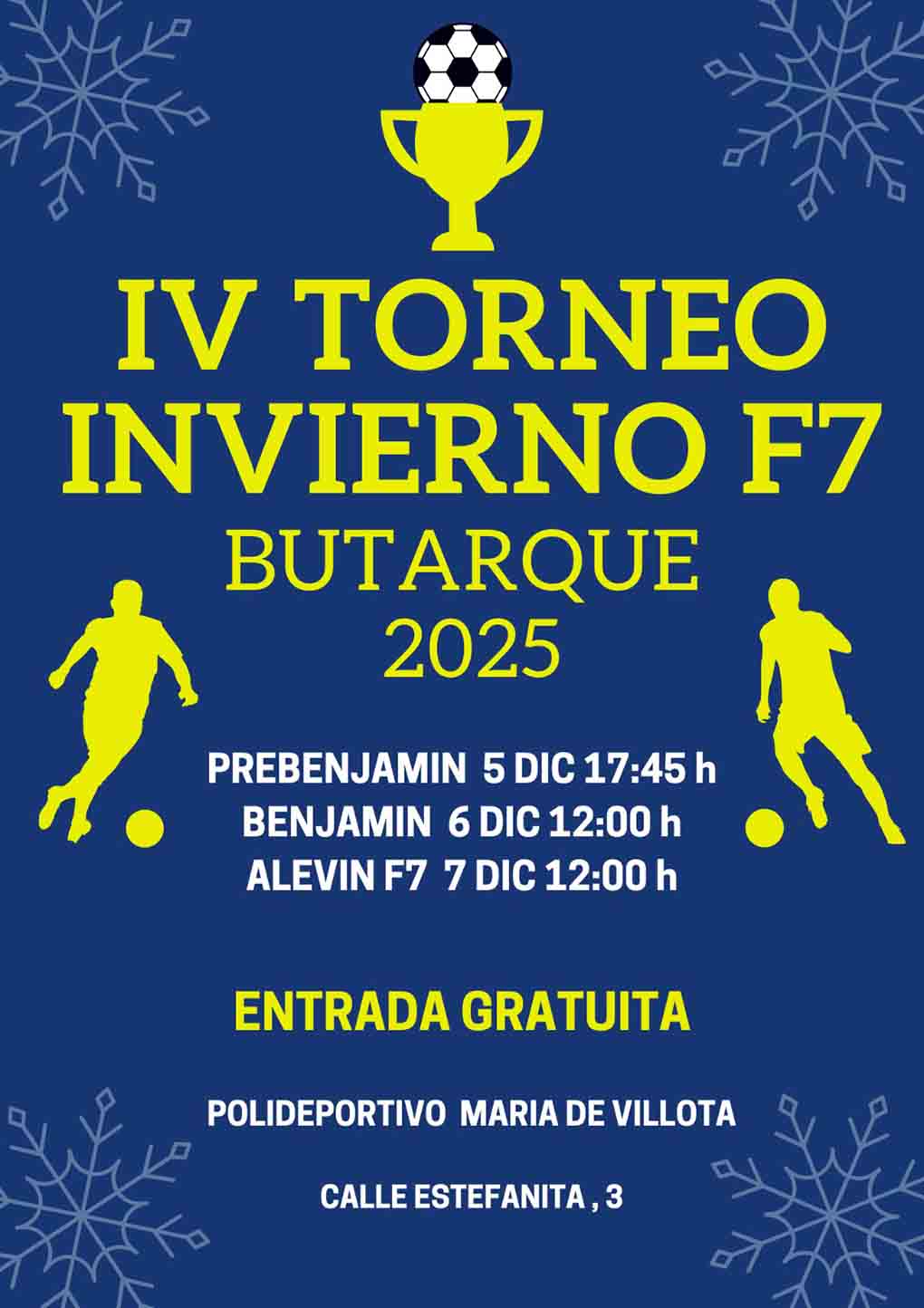 El primer fin de semana del mes de diciembre traerá consigo, al igual que en años anteriores, la disputa del Torneo F7 de Invierno de Butarque en la Instalación Deportiva Básica (IDB) María de Villota (calle de Estefanita, 3), que llegará a su cuarta edición. En pleno Puente de la Constitución y de la Inmaculada, el balón seguirá rodando durante los días 5, 6 y 7 de diciembre en el polideportivo de Villaverde y los principales protagonistas serán jóvenes promesas del balompié de ambos sexos, de entre 6 y 12 años de edad, que darán lo mejor de sí para alzarse con el trofeo de campeones.